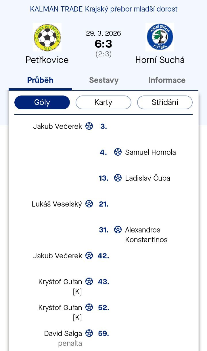 Branky: 3. Večerek Jakub, 21. Veselský Lukáš, 42. Večerek Jakub, 43. Guřan Kryštof, 52. Guřan Kryštof, 59. Salga David (penalta)