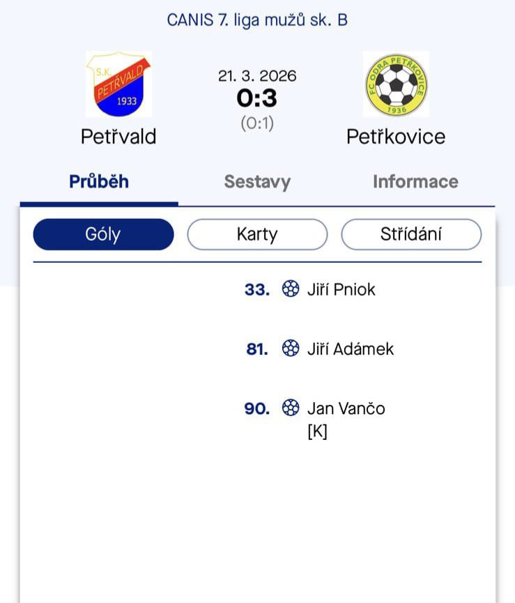 V rámci CANIS 7. ligy mužů sk. B se střetly týmy Petřvaldu a FC Odra Petřkovice. Pro oba celky šlo o první zápas jarní části, který lépe zvládli hosté, když si odvezli přesvědčivé vítězství 3:0.