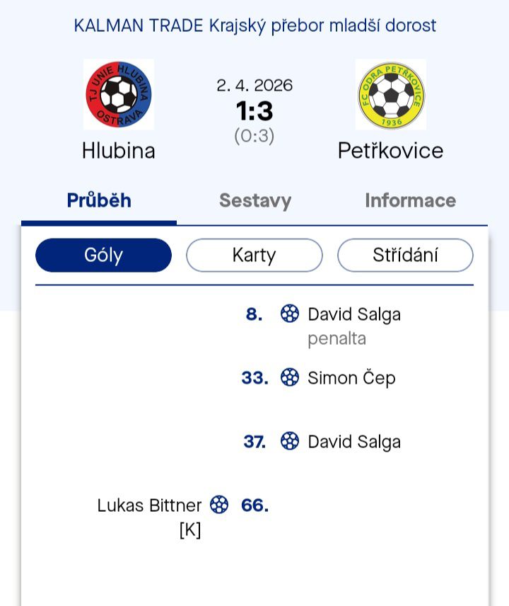 Ten dělal pravé straně obrany Hlubiny značné problémy a svou rychlostí a zarputilostí se podílel na dvou brankách. Nejprve vytrvalým presinkem obral obránce o míč a samostatný nájezd proměnil. Následně utekl po levém křídle, jeho centr napálil do tyče Jakub Večerek a dorážku, i s tečí soupeře, uklidil do brány David Salga – 3:0 pro Odru.