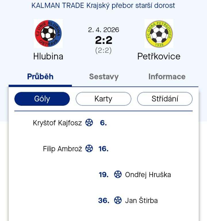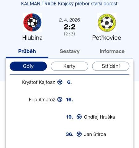 Druhý poločas byl o velké bojovnosti našeho týmu, kdy jsme bránili kvalitu soupeře. I když měla Hlubina převahu a nastřelila dvě tyče, podařilo se nám remízový stav udržet.